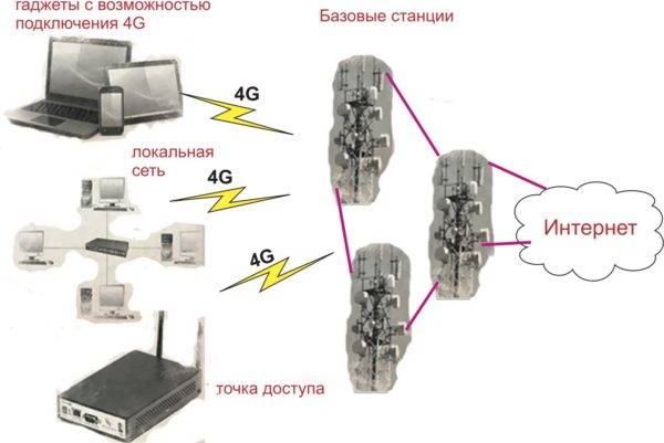 Для успешной работы технологии WiMAX необходимы базовая станция и приемник. Приемник и антенна базовой станции соединяются в низкочастотном диапазоне 2-11 ГГц. Пропускная способность стандарта до 1 Гбит/с, радиус действия до 10 км. Схема работы сети 4G показана на рис. 2.