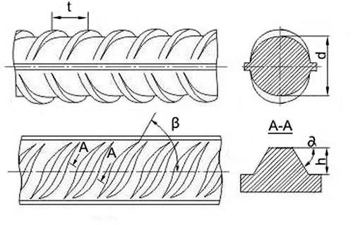 Они обе имеют периодический профиль с продольными и поперечными рёбрами, который обеспечивает прочное сцепление металла со смесью бетона. Поперечные рёбра располагаются под углом и разделены на 2 части, которые сходятся в одной точки. Такая форма надёжно фиксирует металлический прут в строительной смеси. Итоговая конструкция получается прочной и способна выдерживать значительные нагрузки. Диаметр профиля варьируется от 6 до 40 миллиметров. Подробные характеристики для прутов каждого сечения расписаны в ГОСТ 5781-82. В документации есть все данные, необходимые для расчёта прочности конструкции и подготовки инженерно-строительной документации.