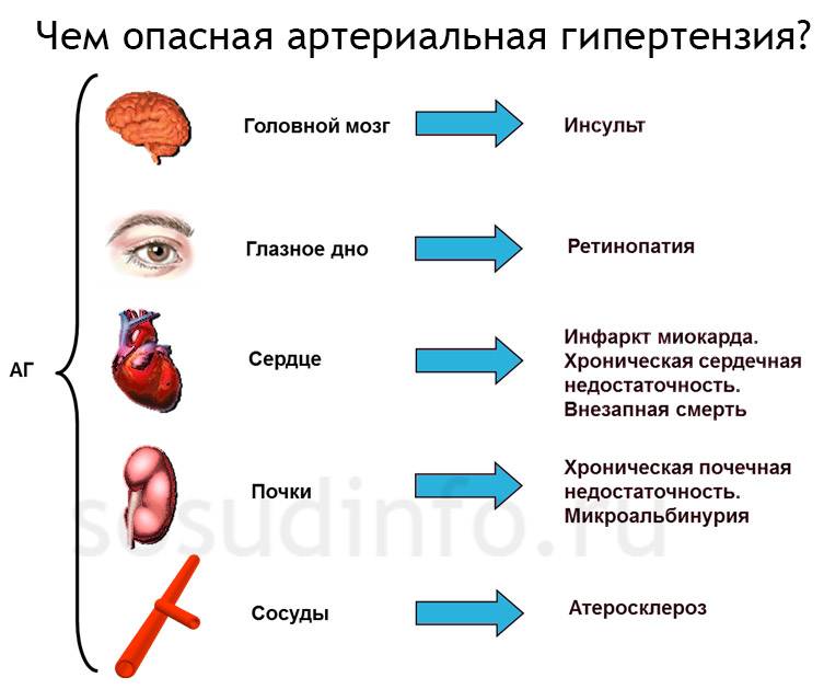 Чем опасна артериальная гипертония? Главные осложнения гипертонической болезни – это вовлечение в процесс сердца, сосудистого русла, почечной системы, глазных яблок и головного мозга. Если поражается сердце, последствия могут быть печальными от сердечной астмы и стенокардии до отека легких и инфаркта миокарда. Когда затронуты органы зрения – это грозит отслоением сетчатки и наступлением необратимой слепоты.