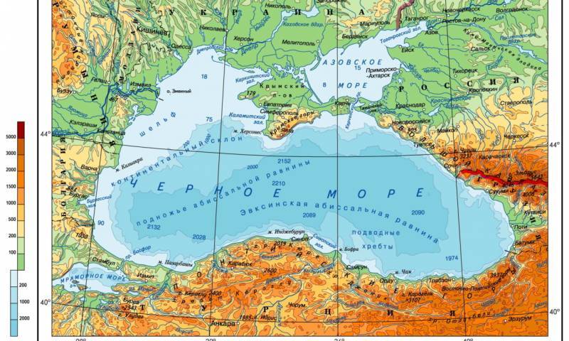 Черное море гораздо глубже Азовского. Средняя глубина черноморской впадины равна 1240 м, максимальная — 2210 м. Рельеф дна у него тоже посложнее. На севере прибрежная полоса более пологая. К юго-востоку в Черном море образуются крутые обрывы, уклоны и подводные каньоны, которые часто становятся причиной смерти неопытных ныряльщиков.