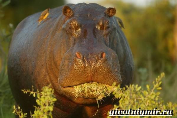 В пищу идет все разнотравье, подходят камыши и молодые побеги кустарников и деревьев. Случается, правда, что бегемот поедает падаль возле водоема. Но это явление слишком редкое и не нормальное.