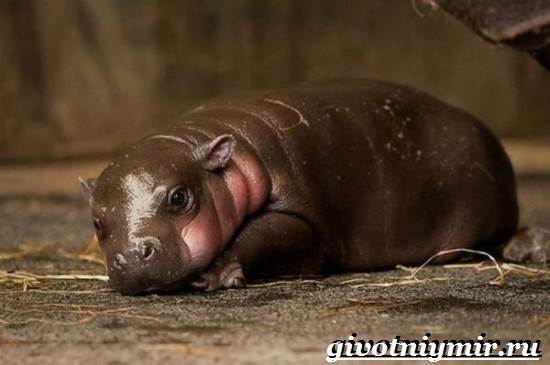 Ноги мини гиппопотама более длинные, шея хорошо просматривается, во рту всего 1 пара резцов (у обыкновенного их две). Спина животного слегка наклонена вперед, ноздри и глаза практически не выделяются. Длина тела – 1.5-1.7 метра, высота – 0.8 метра. Защитная жидкость на теле приобретает розовый оттенок, у большинства обыкновенных бегемотов она красная.