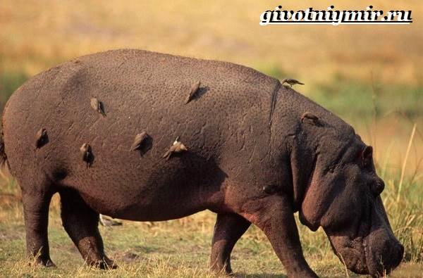 - У бегемота нет сальных желез, потому он должен большую часть времени проводить в воде. На солнцепеке тело быстро обезвоживается, кожа растрескивается, открываются старые и появляются новые раны.