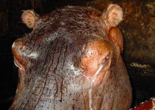 - Периодически на шкуре гиппопотама возникают кровавые потеки, напоминающие пот. В действительности ничего общего с кровью они не имеют. В сильную жару организм животного генерирует особую розовую жидкость, защищающую кожу от палящего солнца и одновременно служащую антисептиком. Под ее воздействием многочисленные раны и трещины на коже бегемота быстро затягиваются.