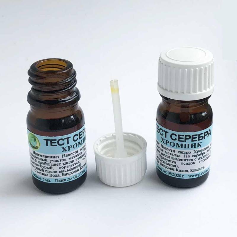 В специализированных магазинах можно приобрести химические реактивы для проверки серебра на подлинность в домашних условиях. К их числу относится хромпик. Составы продаются в стеклянных или пластиковых флаконах с аппликатором.