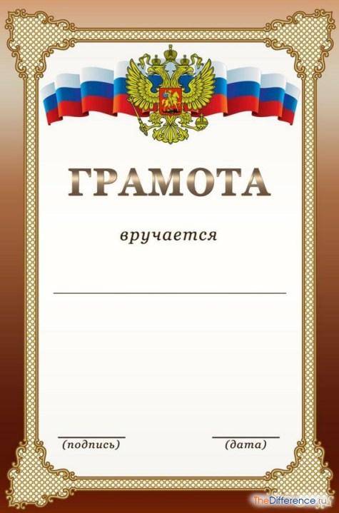 – документ, вручаемый в награду за успехи в каком-либо деле. Под данным термином также понимается официальный письменный акт, подтверждающий правовые отношения или заключение международных соглашений. Грамота подобного рода может быть ратификационной, верительной и т. д. Само слово стало употребляться на Руси в X веке в значении письма или делового документа. Термин пришел к нам из Византии, где grammata обозначала указы, послания и прочие важные бумаги. Изначально грамоты писались на пергаменте, лубе и бересте, досках. С XVI века текст стал наноситься на бумагу. Похвальные и почетные грамоты, о которых и пойдет речь в нашей статье, получили широкое распространение во времена СССР. Они вручались за различные достижения в творческой и спортивной деятельности, трудовые успехи, хорошую учебу, высокие показатели в военной подготовке и т. д. Сегодня ими поощряются преимущественно школьники, участники конкурсов, сотрудники предприятий и компаний.