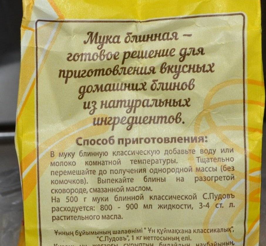 Расфасовывается блинная мука в бумажные пакеты весом нетто 0,5—1,0 кг. На пакетах указывается, помимо общих данных, также рецептура, цена и способ приготовления блинов.