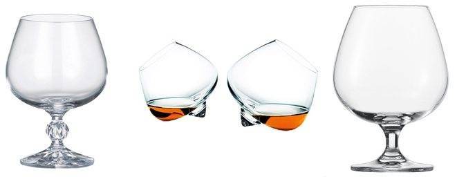 Снифтеры (баллуны) – отличаются широким дном, сужающимся кверху и низкой ножкой. По форме напоминают бутон тюльпана. Предназначены для крепких алкогольных напитков – виски, бренди, коньяка. Также эти напитки могут подаваться в специальных стаканах.