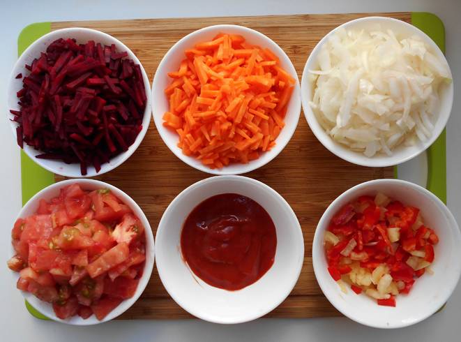 - Очистите и нарежьте свеклу, картофель, морковь и луковицу. Чеснок мелко нарежьте или пропустите через пресс.