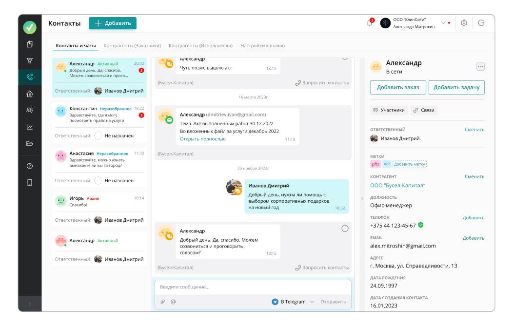 В системе CRM для каждого клиента есть персональная карточка, где можно найти всю деловую переписку и записи телефонных переговоров. А также можно ознакомиться с предыдущими заказами и индивидуальными предпочтениями заказчика.