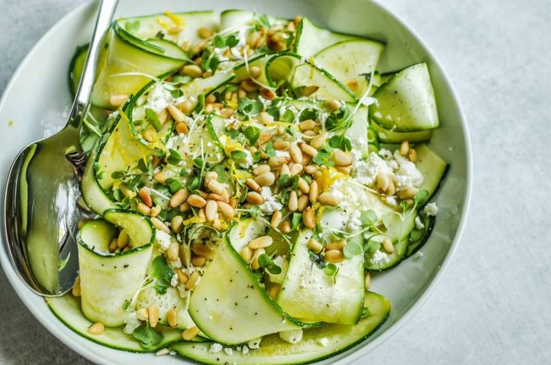 Употреблять цукини в сыром виде можно и даже нужно — это вкусно и максимально полезно. Перед употреблением плод достаточно вымыть под проточной водой, а вот очищать кожуру совершенно не обязательно. В сыром виде цукини можно добавлять в салаты или же употреблять как яблоко.