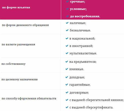 Два из трёх перечисленных видов депозита можно разделить на подвиды по ряду признаков.