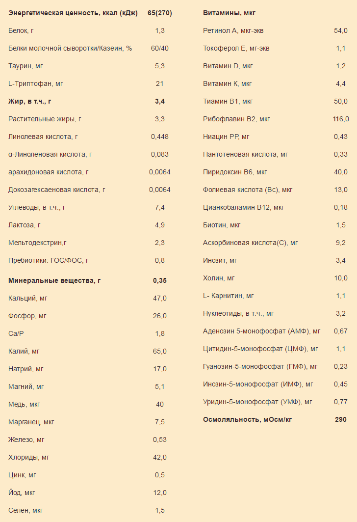 Калорийность малютка2. Химический состав и пищевая ценность.