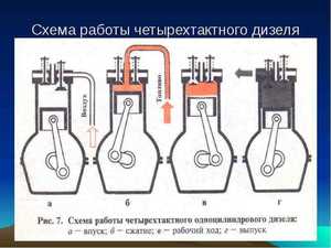 Работа в четырехтактном двигателе совершается за 4 такта: впрыскивание топлива, сжатие топливной жидкости, воспламенение жидкости и расширение рабочего хода, выпуск продуктов горения.