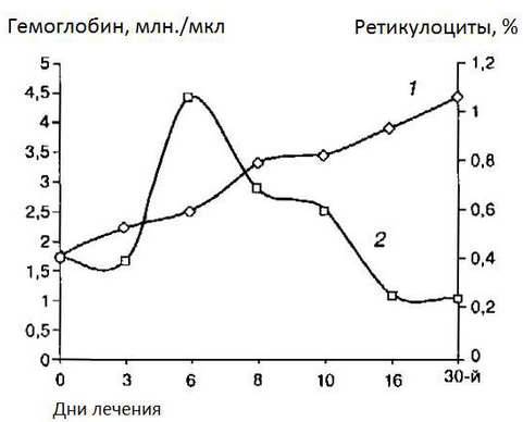 - Через 7-10 дней после начала употребления препарата количество ретикулоцитов (клеток – «предков» эритроцитов) увеличивается на 2-3%.