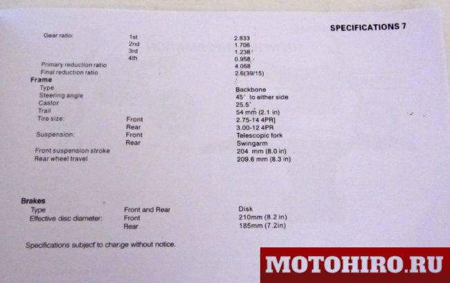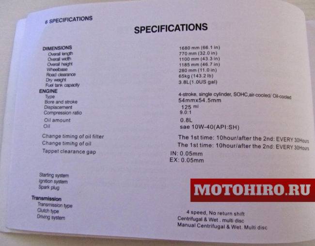 Стандартные параметры ПитБайка. Инструкция к нашему мотоциклу.