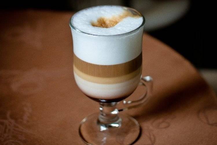 В этот испанский кофе идет сгущенное молоко. Его аккуратно по краю добавляют в уже готовый эспрессо, чтобы за счет разницы плотности напиток расслоился.