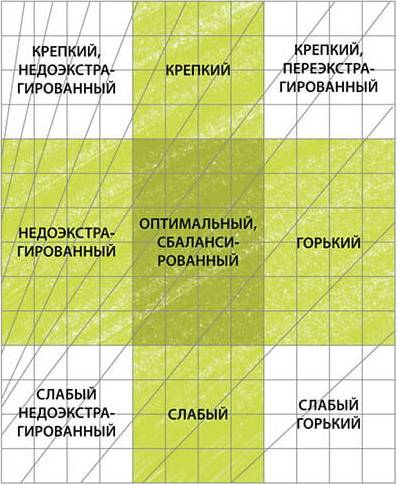 По вертикали, условно, закладка кофе и помол (больше кофе и мельче помол). По горизонтали — время экстракции. Если закладка кофе будет малой, лунго будет слабый, но все равно горький и плоский. Если закладка большая — еще и крепкий (много кофеина). Перевод графика: TastyCoffee.