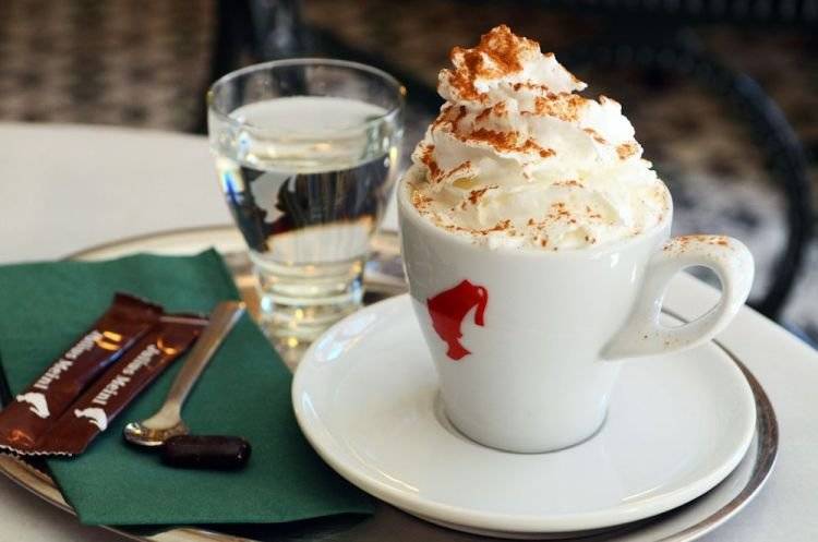 Это классический ароматный эспрессо со взбитыми сливками и опционально – с небольшим количеством молока. Венский кофе украшают порошком какао, ванилью, тертым шоколадом и специями.