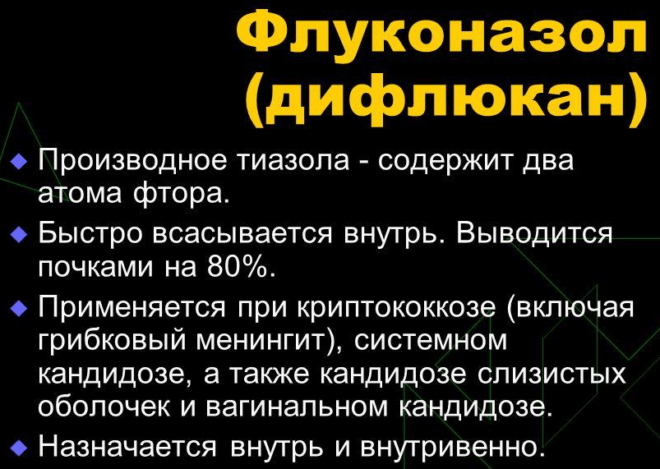 Клинические исследования показывают, что одна пероральная доза вещества (150 мг) имеет 85% эффективность при лечении вагинального кандидоза («молочница») или баланопостита. Буквально, как говорилось в известном фильме, «достаточно одной таблетки».