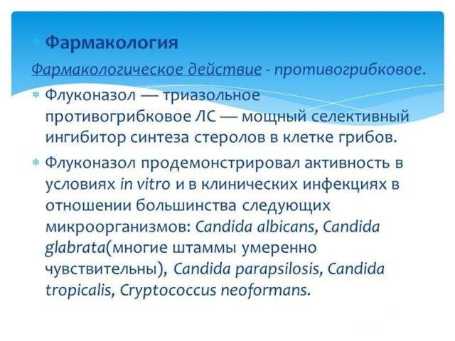 Влияние на организм человека. Препарат подавляет выработку ферментов, участвующих в транспортировке эргостерола, используемого для построения клеточной стенки гриба. Повышение проницаемости клеточной мембраны ускоряет гибель патогенного микроорганизма. В отличие от других противогрибковых веществ, флуконазол не нарушает функции клеток человеческого организма и не влияет на выработку гормонов. К препарату чувствительны грибы рода Кандида, трихофитоны, дрожжеподобные микроорганизмы, дерматофиты.