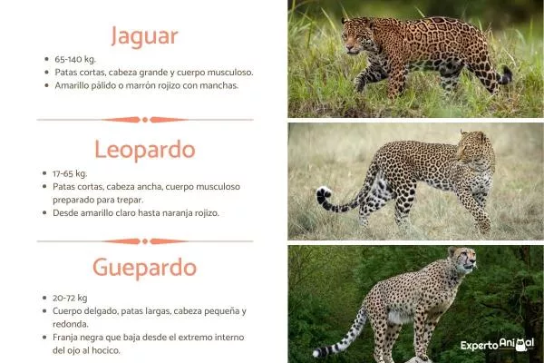 Среди различий между ягуаром, леопардом и гепардом мы находим определенные физические черты, которые могут помочь нам идентифицировать их.