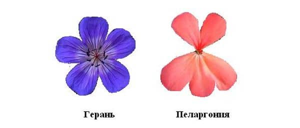 Самым явным отличием между растениями считается структура цветов. У пеларгонии они образуют большие декоративные соцветия и образуют яркие шапки. Чаще всего они имеют асимметрично расположенные лепестки – верхние два отделены от остальных. Как следствие, бутоны имеют неправильную форму. Число плодородных тычинок составляет не больше 7. Остальные же всегда недоразвиты.