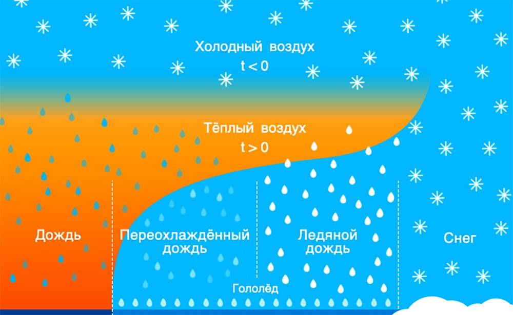 Осадки в виде ледяного дождя, крупинки льда, дождя и снега замерзают на переохлажденных поверхностях. В свою очередь, они возникают из-за температурной инверсии, когда у самой земли находится теплый слой воздуха, а над ним — холодный. Также требуется спокойное время.