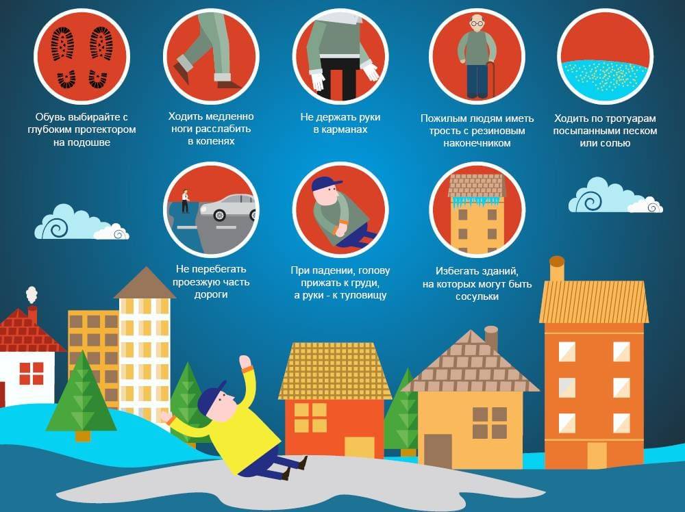 Людям тоже рекомендуется соблюдать осторожность в период появления гололедных явлений. Для этого требуется соблюдать следующие правила: