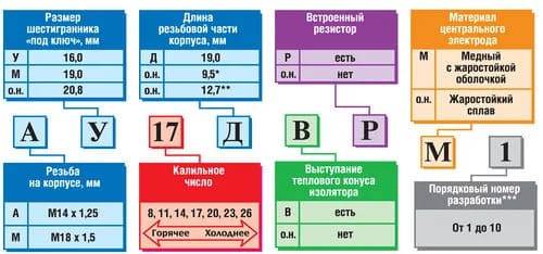 Калильное число обозначается первыми цифрами, которые располагаются ближе к левой части маркировки. Последние цифры в правой части буквенно-числовой комбинации могут означать величину зазора между электродами или порядковый номер разработки. Например, в маркировке А-У17ДВРМ10 калильное число обозначается числом 17.
