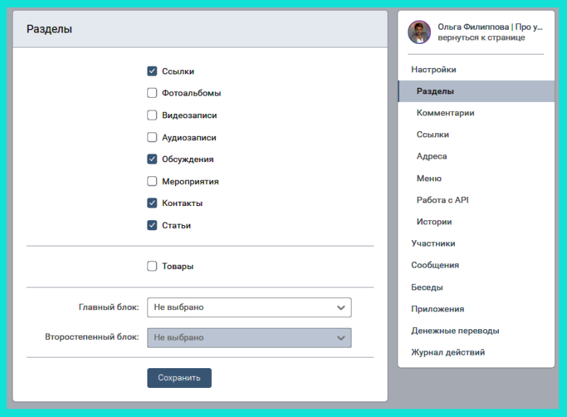 Разделы в паблике могут быть включены или выключены. Включенные разделы отображаются у подписчиков паблика, выключенные – нет.