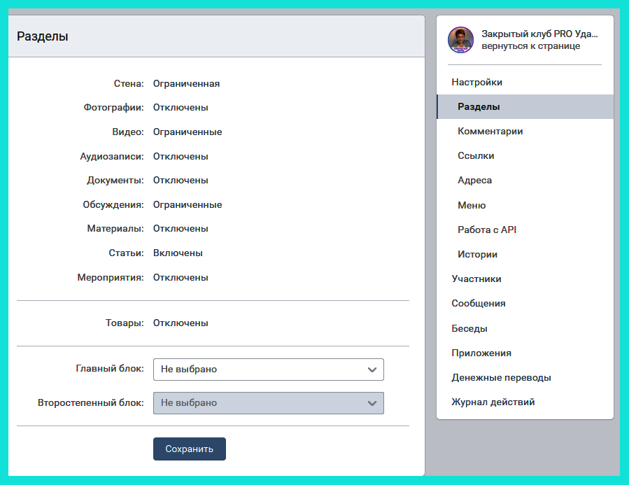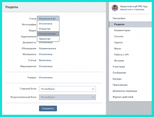 Разделы в паблике могут быть включены или выключены. Включенные разделы отображаются у подписчиков паблика, выключенные – нет.