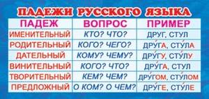 Падежи в русском языке, таблица которых представлена выше, довольно легко запоминаются и быстро определяются благодаря вспомогательным словам: