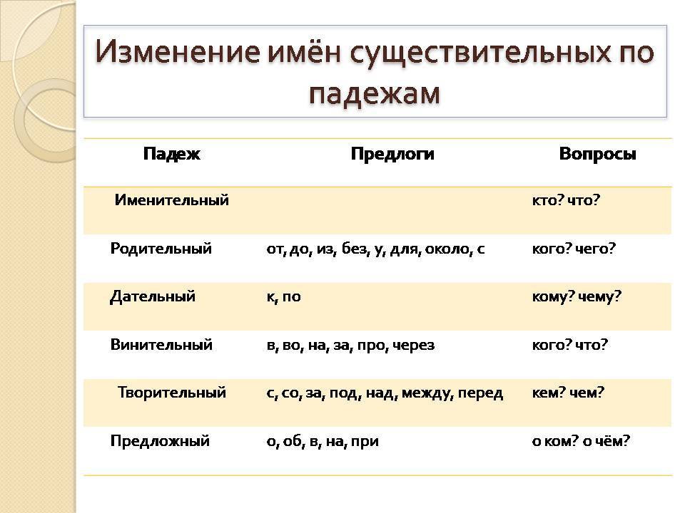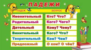 Падежи в русском языке, таблица которых представлена выше, довольно легко запоминаются и быстро определяются благодаря вспомогательным словам: