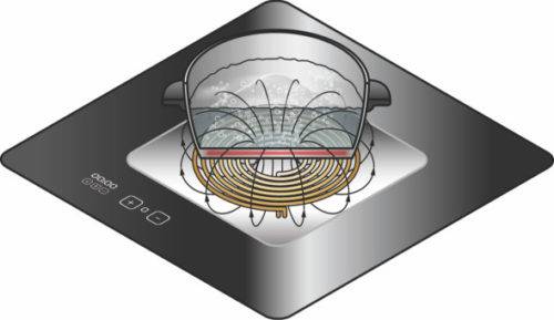 Индукционные плиты разогревают металлическую посуду индуцированными вихревыми токами, создаваемыми высокочастотным магнитным полем порядка 20-100 кГц. Именно дно посуды становится нагревательным элементом; для такой плиты нужны будут кастрюли и сковородки с ферромагнитным (стальным, чугунным, из нержавеющей стали) первым снизу слоем в дне.