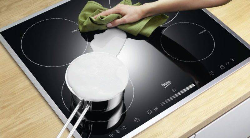 При готовке на индукционной панели тоже могут возникнуть неприятные моменты, когда часть пищи попадает мимо кастрюльки, а молоко при интенсивном нагреве закипает и выливается на стеклокерамику.