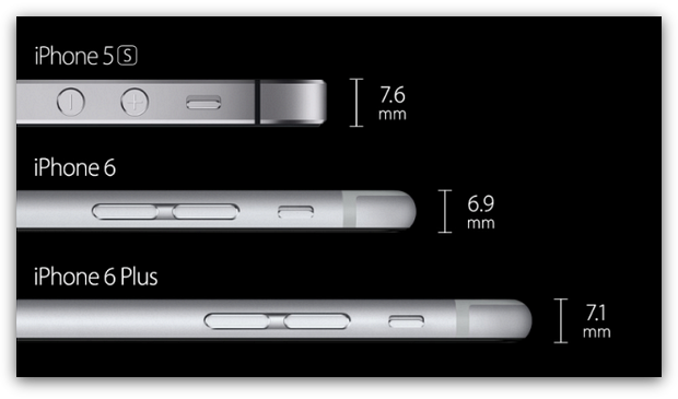 iPhone 6 тоньше iPhone 5S, но разница скорее символическая. Если раньше Apple сплющивала толщину девайса хотя бы на миллиметры, то на этот раз речь идёт уже о десятых миллиметра. Толщина iPhone 6 составляет 6.9 мм против 7.6 мм у iPhone 5S. При этом у Apple ничего не получилось сделать с глазком камеры: он теперь заметно выступает из корпуса примерно на 2 миллиметра, что в принципе нивелирует всю разницу в толщине двух корпусов.