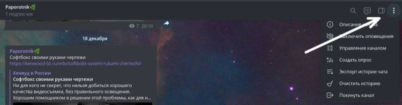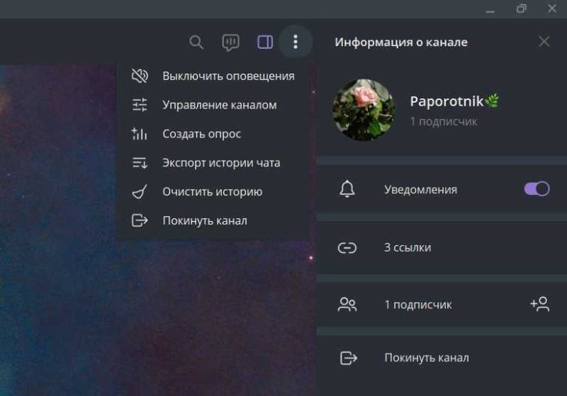 Рассмотрим расположение настроек на базе десктопной версии программы. Их можно посмотреть во вкладке канала в правом верхнем углу.