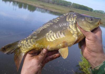 - Зеркальный. Этот вид легко отличим от сазана отсутствием чешуи на большей части тела – расположена она только лишь на спине, у жабр и хвостового плавника, а также вдоль средней линии туловища. Встречается зеркальный карп реже, чем обыкновенный, также он, как правило, меньшего размера.