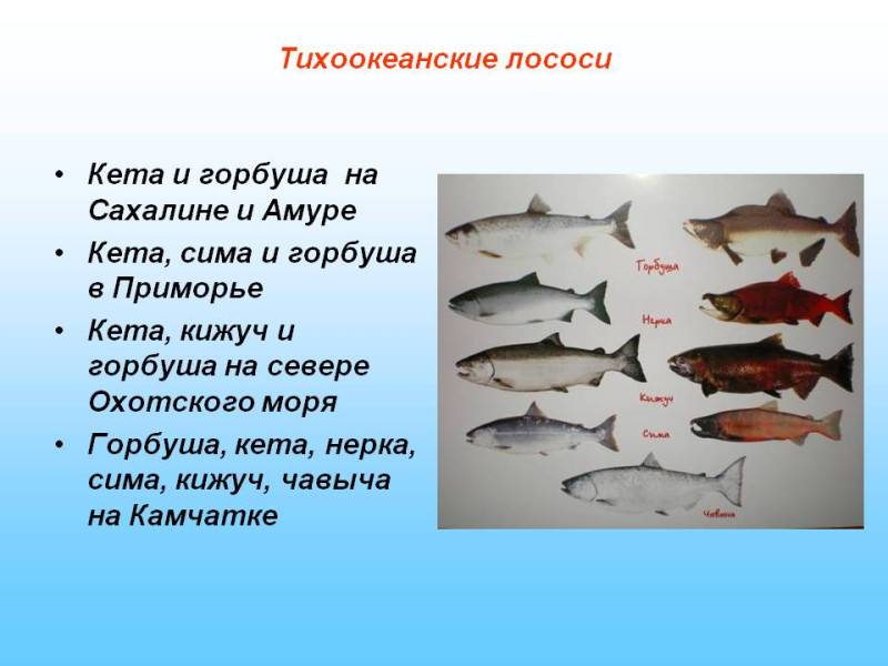 Ведь горбуша, кета, нерка, кижуч, чавыча, сима, это все виды Тихоокеанского лосося. Настоящий лосось – это семга, относящаяся к атлантическому лососю.