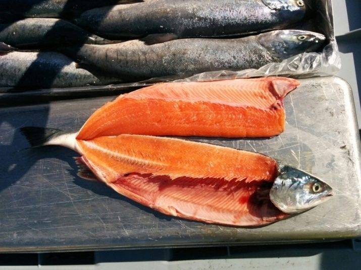 - Цвет мяса. Филе горбуши имеет неяркий розовый оттенок. А вот мясо кеты имеет достаточно контрастный и яркий оттенок.