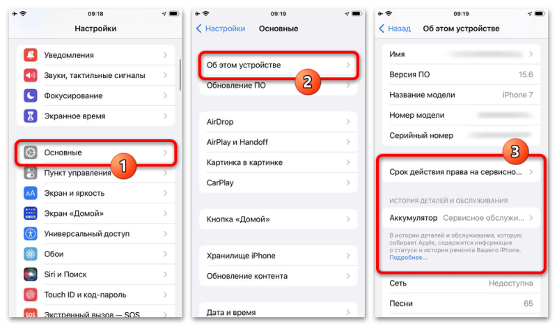 Разобравшись с этим, откройте системные параметры, перейдите в категорию «Основные» и разверните раздел «Об устройстве». Именно здесь в рамках блока «История деталей и обслуживания» будут указаны как текущие проблемы с устройством, так и все замечания по заменам и проведенным ремонтам.