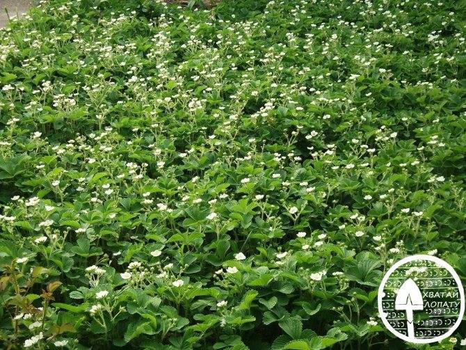 ковровая посадка – удобный и легкий метод, не требуется обрезать усики клубники. Земляника разрастается, образуя пышный зеленый ковер. Недостаток – ягоды более мелкие, в районах с частыми и обильными осадками, таким способом не рекомендуется сажать клубнику из-за влажного микроклимата внутри растений. Подойдет для юга России, где лето жаркое и солнечное;