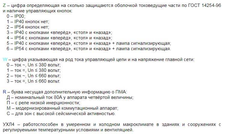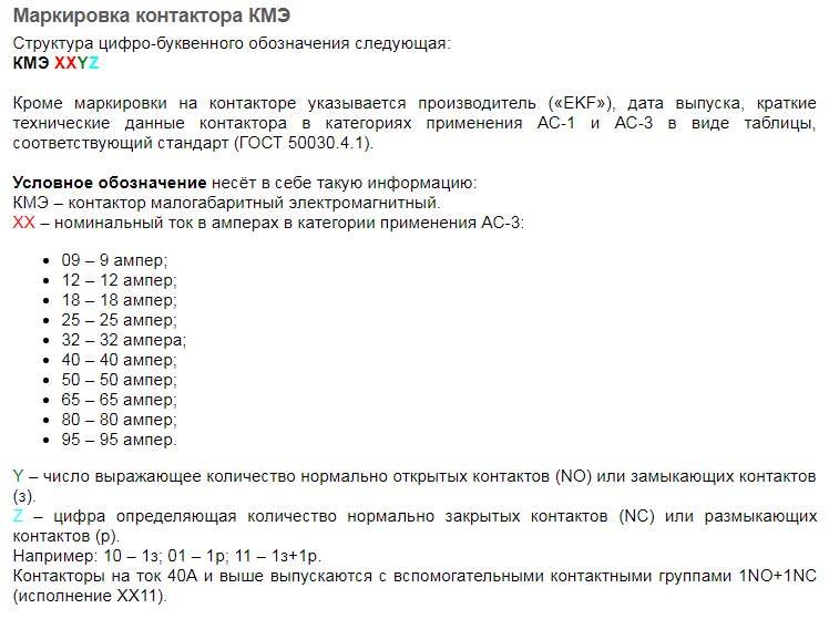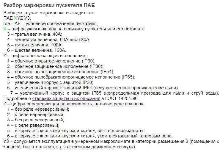 На корпусе модели производитель должен указать: величину пускателя, коммутируемые токи, рабочее напряжение, мощность нагрузки, соответствие ГОСТу или ТУ.