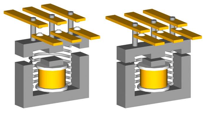 - Пластиковая траверса (4), на которой закреплены мостики (2), соединена с подвижным якорем (5). Вся конструкция может перемещаться вертикально с помощью внешнего усилия (кнопки), и возвращается обратно после прекращения давления на нее.