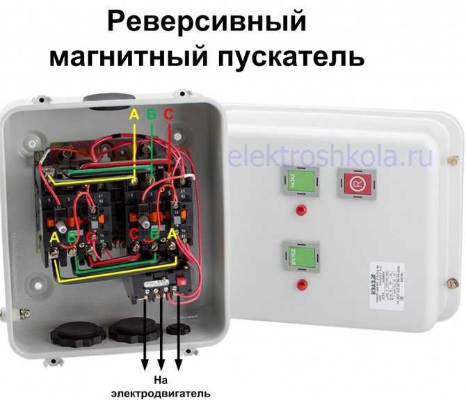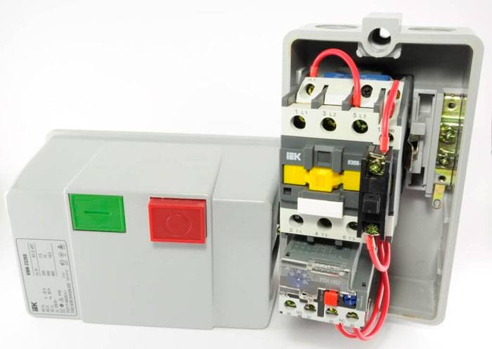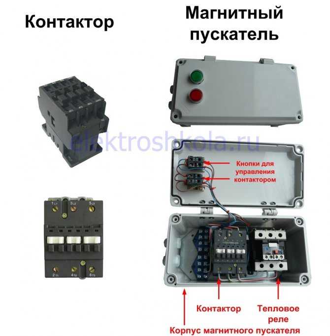 Как видно на картинке выше в состав пускателя входят: контактор — для включения и отключения электродвигателя, тепловое реле — для защиты электродвигателя от перегрузок, кнопки — для управления контактором, все перечисленные устройства помещаются в общий корпус.