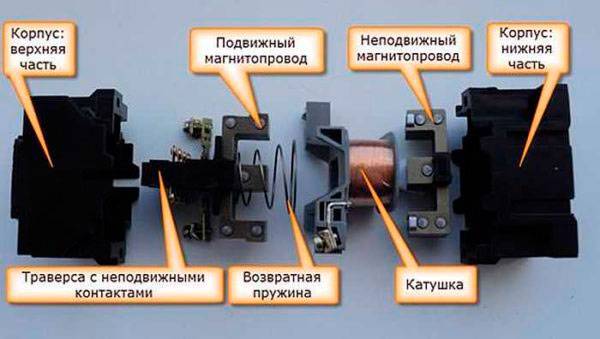 Принцип работы контакторов – при подаче напряжения часть сердечника втягивается, и неподвижные контакты замыкаются с подвижными.