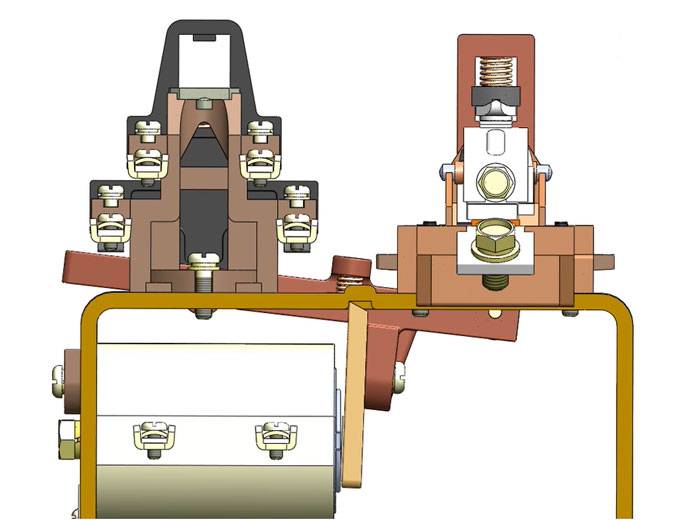 - Они соединяются между собой с помощью контактных мостиков (2). Сила нажатия обеспечивается пружинами (1), которые представляют собой особым образом отформованную стальную пластину. Сами контактные группы изготовлены из медных сплавов, для лучшей электропроводности.