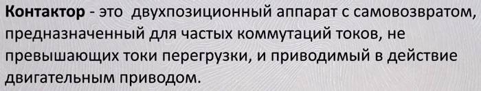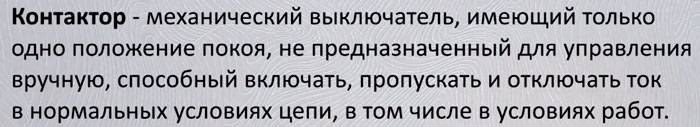 Однако, помимо приведенных выше определений контактора, существует еще несколько определений. Например, СТО 173330282.27.010.001-2008 “Электроэнергетика. Термины и определения” содержит более упрощенную формулировку: