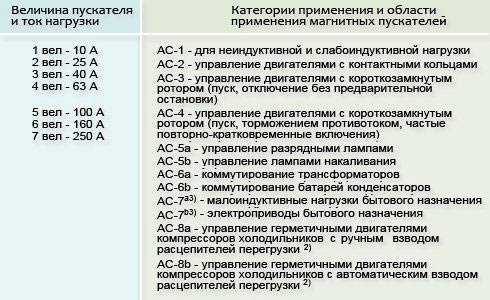 Также при выборе нельзя забывать о способности контактора переносить пусковые токи. Особенно если контактор используется в качестве пускового органа для мощных промышленных двигателей, где пусковые токи могут превышать номинальные в десять раз. Для этого контакторы различаются по категории применения (обозначение AC и номер категории).